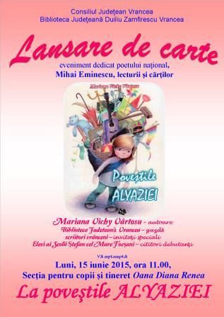 Evenimentul, care va avea loc la Secţia pentru copii şi tineret “Oana Diana Renea” a Bibliotecii Judeţene, este dedicat poetului naţional Mihai Eminescu, lecturii şi cărţilor. La lansare şi-au anunţat prezenţa elevi ai Şcolii „Ştefan cel Mare” Focşani. „Tot ce-mi doresc este ca vorbele mele să ajungă la sufletul ei, la sufletul copiilor de vârsta ei, să transmită emoţia pe care eu am trăit-o imaginându-mi că-i vorbesc. În rest, nimic nu mai contează”, spune Mariana Vichy Vârtosu. Autoarea „Poveştilor Alyaziei” a vizitat marţi Şcoala 7 din Focşani unde şi-a lansat, spre bucuria elevilor de aici, volumul scos cald de sub tipar. Cei mici au avut ocazia de a cunoaşte o altă doamnă a scrisului, Virginia Bogdan. „Elevii Şcolii Nr. 7 au vibrat la unison, trăind emoţia de a cunoaşte "în carne şi oase" un scriitor şi au descifrat tainele "Poveştilor Alyaziei", pe care au îmbrăţişat-o la piept şi au declarat-o "Dragostea lor, la prima vedere"! Învăţaseră şi până acum să îmbrăţişeze o carte, însă astăzi, îmbrăţişând şi un scriitor, au consolidat puntea ce leagă sufletul şi literatura adevărată”, ne-a transmis profesoara pentru învăţământ primar Silvia - Marina Baciu. (M. V.)