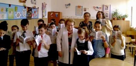 Mariana Vichy Vârtosu, înconjurată de elevii Şcolii 7 la lansarea cărţii