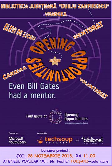 Biblioteca Judeţeană „Duiliu Zamfirescu” Vrancea împreună cu Biblionet şi TechSoup România, cu sprijinul Microsoft România, demarează un program de orientare profesională pentru elevii de liceu din Focşani. „Opening Opportunities” este un program de orientare educaţională şi de carieră în care voluntari Microsoft România sprijină elevii de liceu să exploreze opţiuni profesionale şi să îşi dezvolte propriul plan de carieră, în perioada noiembrie 2013 – iunie 2014. „Împreună ne propunem să ajutăm tinerii să facă alegeri educaţionale şi profesionale conştiente şi informate, prin acces direct la exemplul nemijlocit al celor care au făcut deja aceste alegeri şi profesează în acest moment. Programul îmbină evenimente locale organizate în biblioteci publice cu sesiuni de mentorat online şi seminarii online publice – totul cu scopul de a oferi elevilor de liceu informaţii actuale despre piaţa muncii şi care sunt abilităţile şi cunoştinţele necesare în acest mediu dinamic. Bibliotecile incluse în proiect vor organiza întâlniri de studiu ale elevilor incluşi în proiect dar şi alte întâlniri cu profesionişti din companii locale de tehnologie”, transmit organizatorii. Lansarea proiectului va avea loc joi, 28 noiembrie, la sala mare a Ateneului Popular ”Mr. Gh. Pastia” Focşani, începând cu ora 11.00, unde sunt aşteptaţi toţi elevii de liceu care sunt interesaţi de a-şi dezvolta un plan de carieră şi care doresc sprijinul unui mentor. Vor fi alături de tinerii focşăneni voluntari de la Microsoft România, TechSoup şi reprezentanţi ai programului Biblionet. Detalii despre eveniment vor fi disponibile în curând pe www.openingopportunities.ro sau www.facebook.com/OpeningOpportunities.