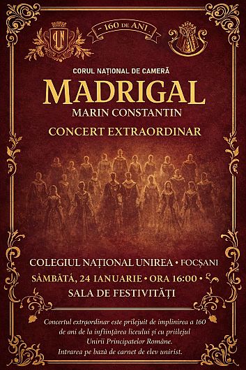 Focșaniul intră, sâmbătă, 24 ianuarie 2026, pe harta marilor întâlniri culturale. Corul Național de Cameră „Madrigal – Marin Constantin” va susține un concert extraordinar la Colegiul Național „Unirea” din Focșani, în Sala de Festivități, de la ora 16:00. Evenimentul are loc într-un context cu dublă încărcătură simbolică: 160 de ani de la înființarea liceului și Ziua Unirii Principatelor Române.