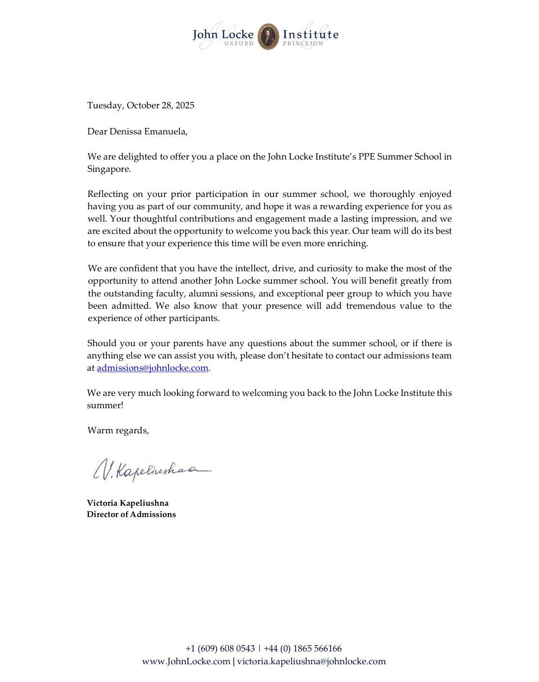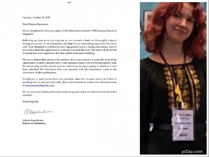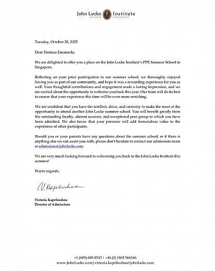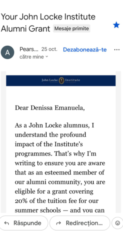 „Reflectând asupra participării tale anterioare la școala noastră de vară, ne-a făcut plăcere să te avem ca parte a comunității noastre și suntem încântați să te revedem în acest an. Echipa noastră va face tot posibilul ca experiența ta să fie și mai valoroasă”, se arată în scrisoarea oficială de invitație transmisă de Victoria Kapeliushna, Directorul de Admitere al John Locke Institute.