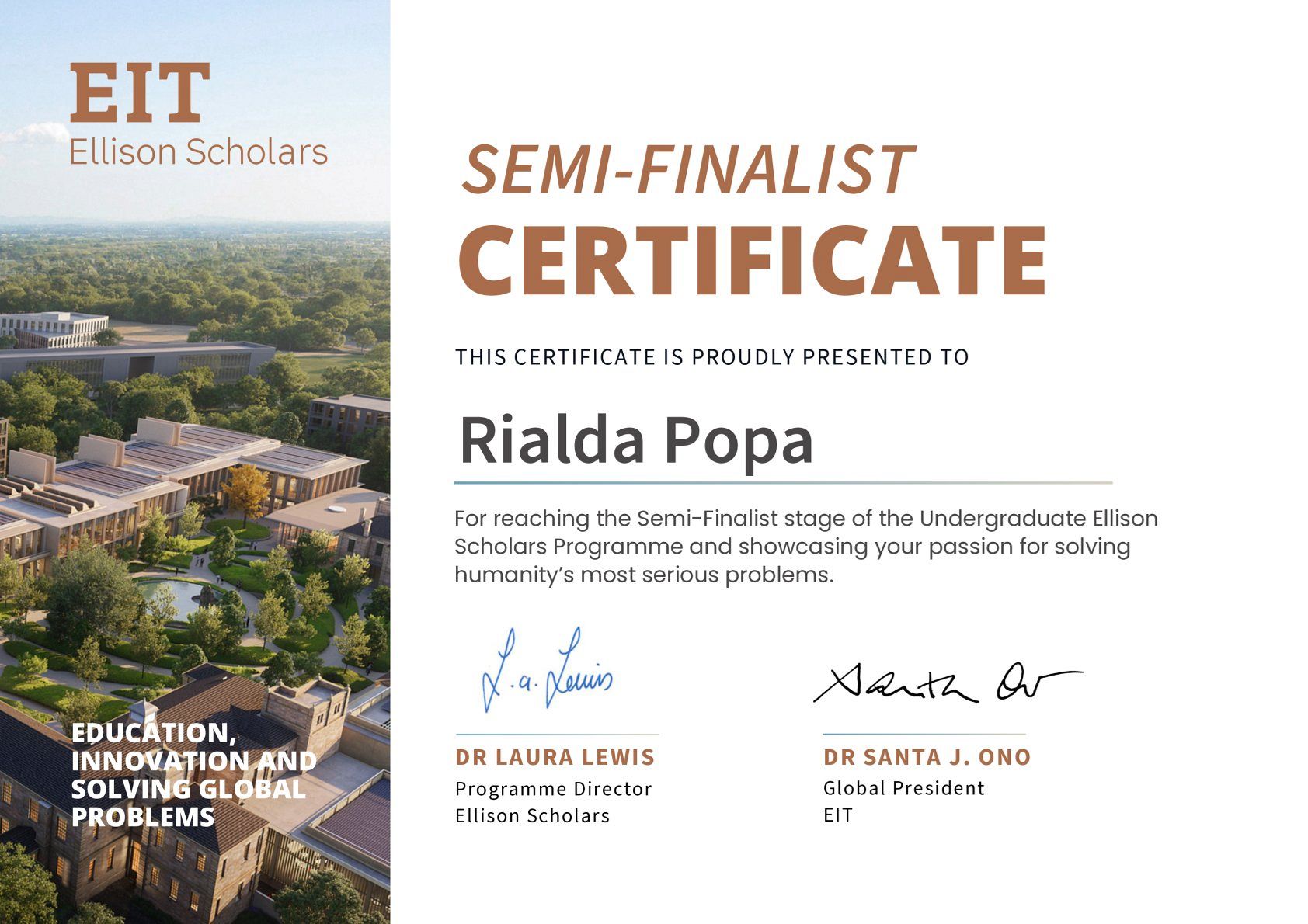 După această experiență la Londra, Rialda a reușit o nouă performanță remarcabilă: a fost selectată semifinalistă în Programul Ellison Scholars 2026–2030, organizat de prestigiosul Ellison Institute of Technology (EIT), fondat de miliardarul Larry Ellison – creatorul companiei Oracle.