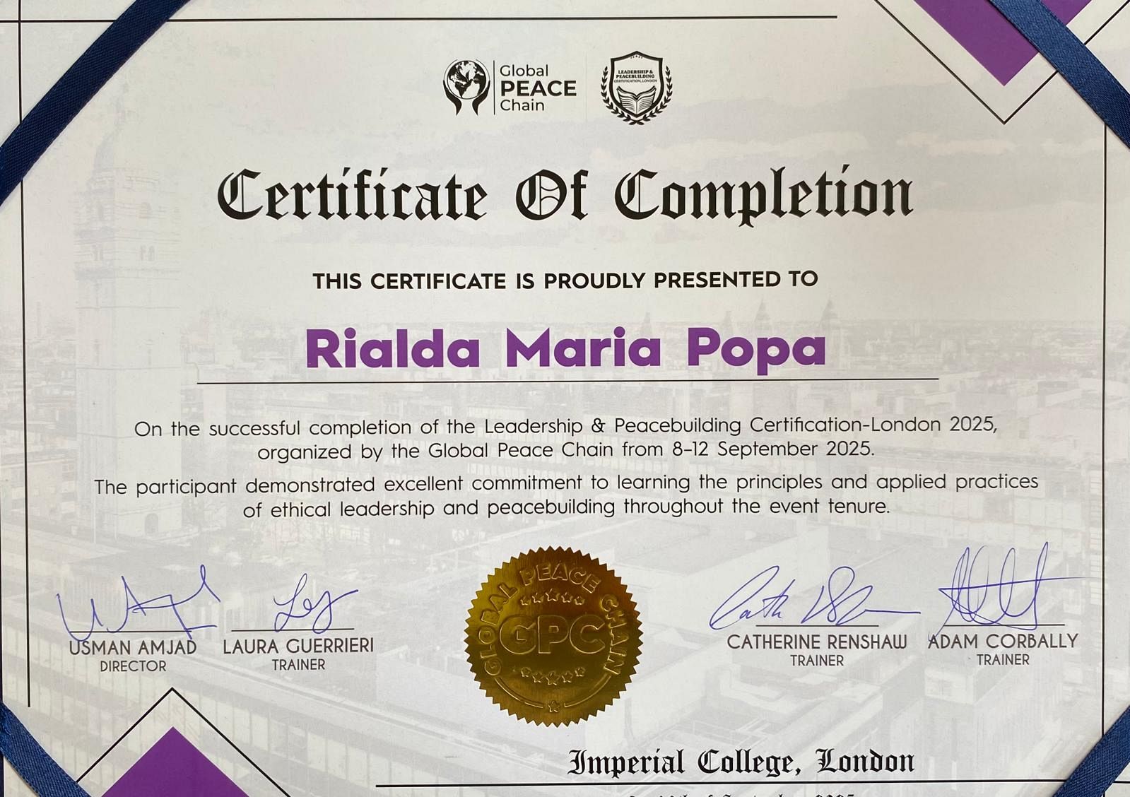 Performanțele de excepție ale tinerilor vrânceni continuă să aducă mândrie județului. Rialda Maria Popa, elevă în clasa a XII-a la Liceul Internațional de Informatică București, a reprezentat România și implicit județul Vrancea la Global Peace and Leadership Summit – Londra 2025, desfășurat la Imperial College London între 8 și 12 septembrie 2025.