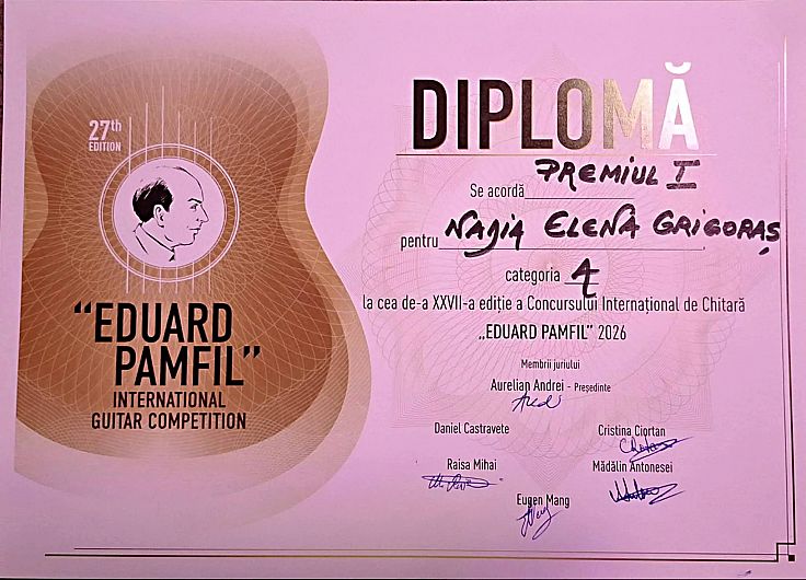 Premiul I obținut de Nadia Grigoraș la Concursul Internațional de Chitară „Eduard Pamfil” 2026 poate reprezenta doar începutul unei cariere muzicale promițătoare. La doar câțiva ani de studiu, tânăra elevă demonstrează disciplină, talent și pasiune pentru muzică – ingrediente esențiale pentru reușită.