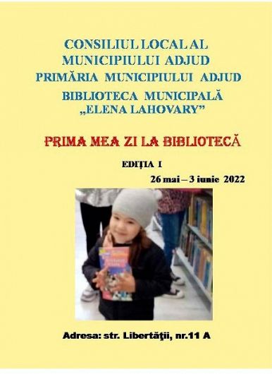 Biblioteca Municipală ,,Elena Lahovary”, în perioada 26 mai – 3 iunie 2022, derulează proiectului ,,Prima mea zi la bibliotecă”. Acesta se adresează preşcolarilor şi elevilor din clasele pregătitoare din municipiul Adjud
