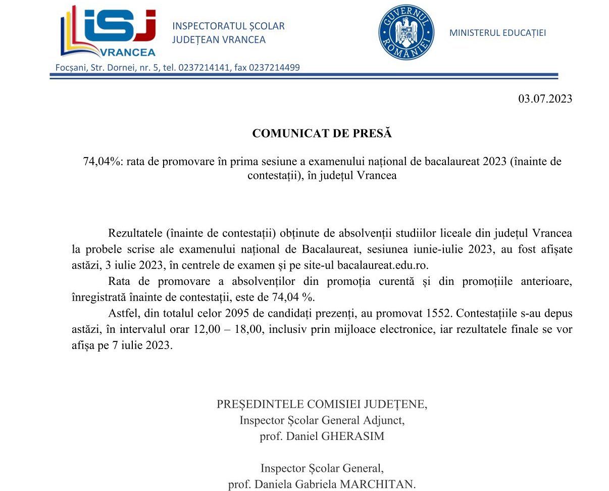 Citiți comunicatul de presă transmis, luni 03 iunlie 2023 de Inspectoratul Școlar Județean(IȘJ) Vrancea după afișarea primelor rezultate de la examenul de Bacalaureat 2023 sesiunea iunie-iulie2023, înaintea depunerii și rezolvării contestațiilor
