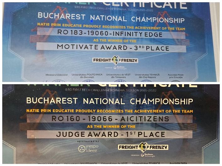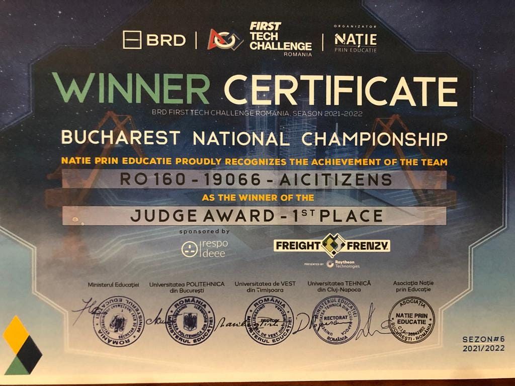 Urmăriți momentul premierii echipei de robotică AICitizens a CNAIC Focșani cu premiul I Judge Award la Campionatul Național de robotică FIRST Tech Chalenge Romania ediția 6 2021/2022 în VIDEO de ma jos începând de la minutul 9:39:00