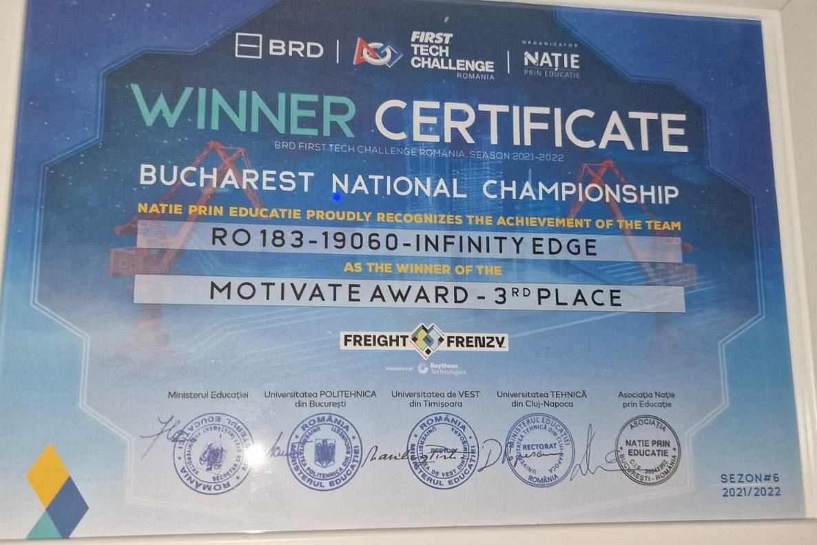 ”Tocmai s-a incheiat, la Bucuresti, etapa finala a Concursului national de robotica First Tech Challenge...48 de echipe, aproximativ 1000 de participanti, 3 echipe din Focsani (remarcabil). La o asa concurenta premiul obtinut de echipa INFINITYEDGE de la CNU este nu numai meritat, ci mult mai pretios decat pare ( cel mai bun rezultat din Vrancea).