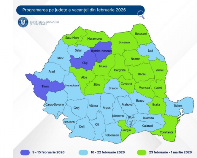 Conform datelor oficiale, vacanța mobilă din februarie 2026 este programată între 9 februarie și 1 martie, însă datele diferă de la un județ la altul, în funcție de decizia inspectoratelor școlare.