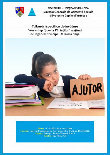 DGASPC Vrancea invită părinții, profesorii și toți cei interesați să participe la workshopul dedicat tulburărilor specifice de învățare.