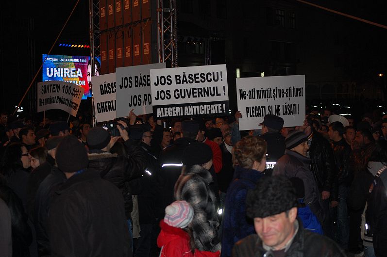 Oamenii care au venit în Piaţa Unirii apăreau pregătiţi mai mult de proteste decît pentru a serba cu patriotism Ziua Unirii. Dacă ar fi venit preşedintele, obişnuita baie de mulţime s-ar fi transformat într-o baie de huiduieli. De altfel, politicienii ne-au recunoscut neoficial că regia a fost cuvîntul de ordine al zilei de ieri. "Am venit ca să pierdem vremea. Este o zi importantă şi trebuie sărbătorită, dar zilele noastre sînt tot amare, tot «fripte»", ne-a spus o femeie din mulţime. "Ne-a luat tot Băsescu, numai sufletul din noi nu", a strigat un alt cetăţean în faţa microfonului ZdV. La întrebarea reporterilor noştri, cum rămîne cu Ziua Unirii, acelaşi cetăţean a spus că a venit tocmai de la Spulber pentru Ziua Unirii, ca să îşi strige nemulţumirile. "Dacă ar veni Băsescu, l-ar lua lumea cu fulgi cu tot. Nu iese din bîrlogul lui", a strigat protestatarul. O doamnă face apel la unire. "Să ne unim pentru o viaţă mai bună şi să vină la conducere care este în stare să ne conducă. Să se mărească pensiile. Nu-l mai iubim pe Băsescu pentru că a adus ţara în sărăcie", ne-a spus aceasta. (A. I.)