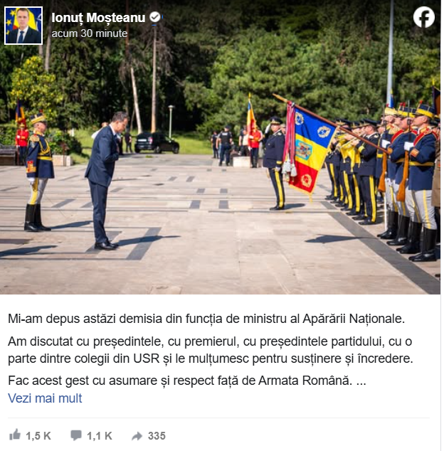 „Mi-am depus astăzi demisia (…) Fac acest gest cu asumare și respect față de Armata Română. Nu vreau ca discuțiile despre formarea mea și greșelile pe care le-am făcut acum mulți ani să-i distragă de la misiunea grea pe cei care conduc acum țara”, a transmis fostul ministru.