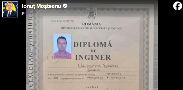 „Pentru asta îmi cer scuze. Este o greșeală care mă jenează”, a scris Moșteanu, adăugând că diploma obținută la Bioterra datează din 2015.