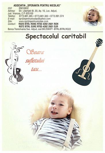 Evenimentul are la restaurantul Casa Albă din Adjud, cu ajutorul celor care au participat şi până acum la evenimentul "Seara Sufletului Tău", concert organizat Virgil Gospodaru. Iniţiatorul acestei strângeri de donaţii pentru recuperarea medicală de specialitate de care are nevoie Nicolas este Virgil Gospodaru care le-a propus acest sprijin părintilor, Ana şi Florin Marin. Părinţii au fost profund impresionaţi că o persoană cu inimă mare vrea să îi ajute. Recuperarea medicală se va face în centrele medicale private din ţară şi din străinatate. În cadrul evenimentului, vor veni oameni valoroşi ai oraşului Adjud precum: Andreea Spulber, Adriana State, Nicu Turcu, Răzvan Spulber, Adrian Silviu-Mironescu, Edi Niculiţă din Oneşti, Virgil Gospodaru, talentaţii elevi ai Liceului Teoretic „Emil Botta” sub îndrumarea doamnei profesoare Alina Zoltan. Acestia vor cânta, vor recita, vor dansa şi, bineînţeles, vor dărui. Dacă dumneavoastră credeţi că Nicolas merită o şansă spre mai bine, haideţi să i-o oferim. Evenimentul este organizat în colaborare cu Asociaţia ” Speranţa pentru Nicolas”. Donaţiile pot fi şi în conturile bancare: