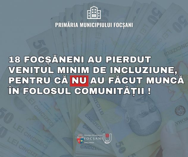 Un număr de 18 beneficiari ai venitului minim de incluziune din Municipiul Focșani au rămas fără acest sprijin financiar, după ce nu și-au îndeplinit obligația legală de a presta ore de muncă în folosul comunității. Măsura a fost dispusă în luna februarie 2026, prin semnarea unor dispoziții oficiale de către primarul Cristi Valentin Misăilă, potrivit unei informări publice făcute marți seară, 10 februarie, de Primăria Municipiului Focșani.