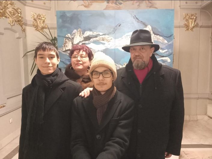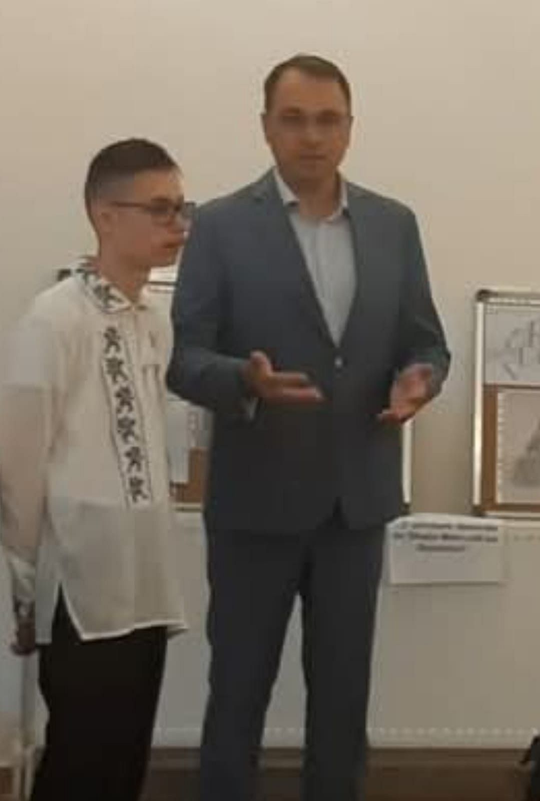 Foto:Andrei împreună cu domnul primar Cristi Valentin Misăila, domnul Sorin Francu, actor al Teatrului „Maior Gh. Pastia", preot Florentin Răuță, cu ocazia vernisajului de la Sinagoga Evreiască