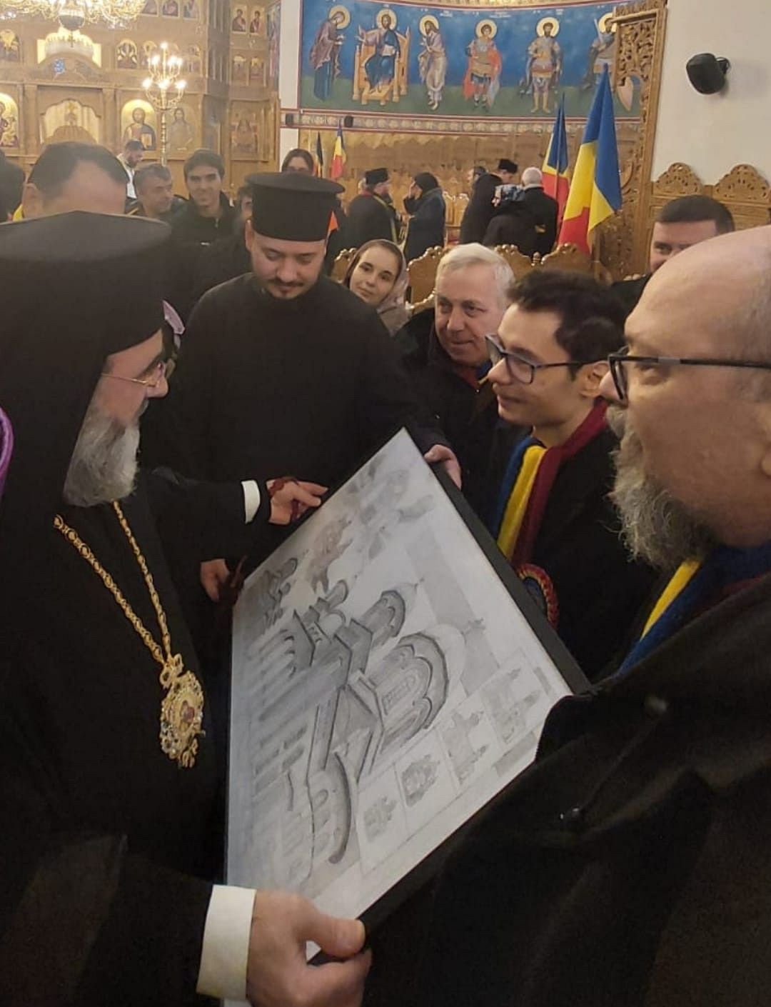 Foto:Andrei înmânează Arhiepiscopului Ciprian tabloul desenat al Catedralei din Focșani