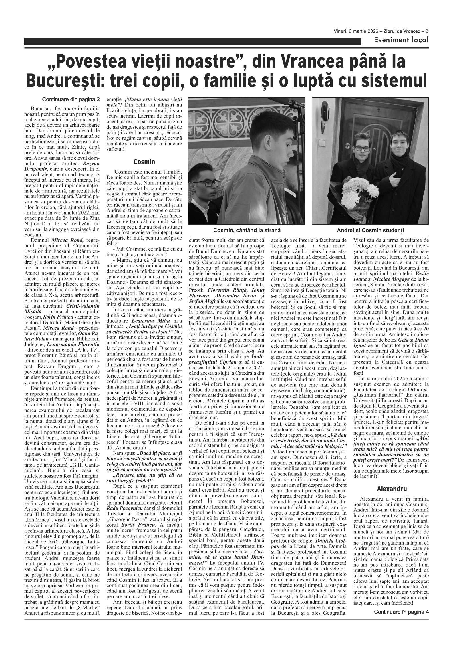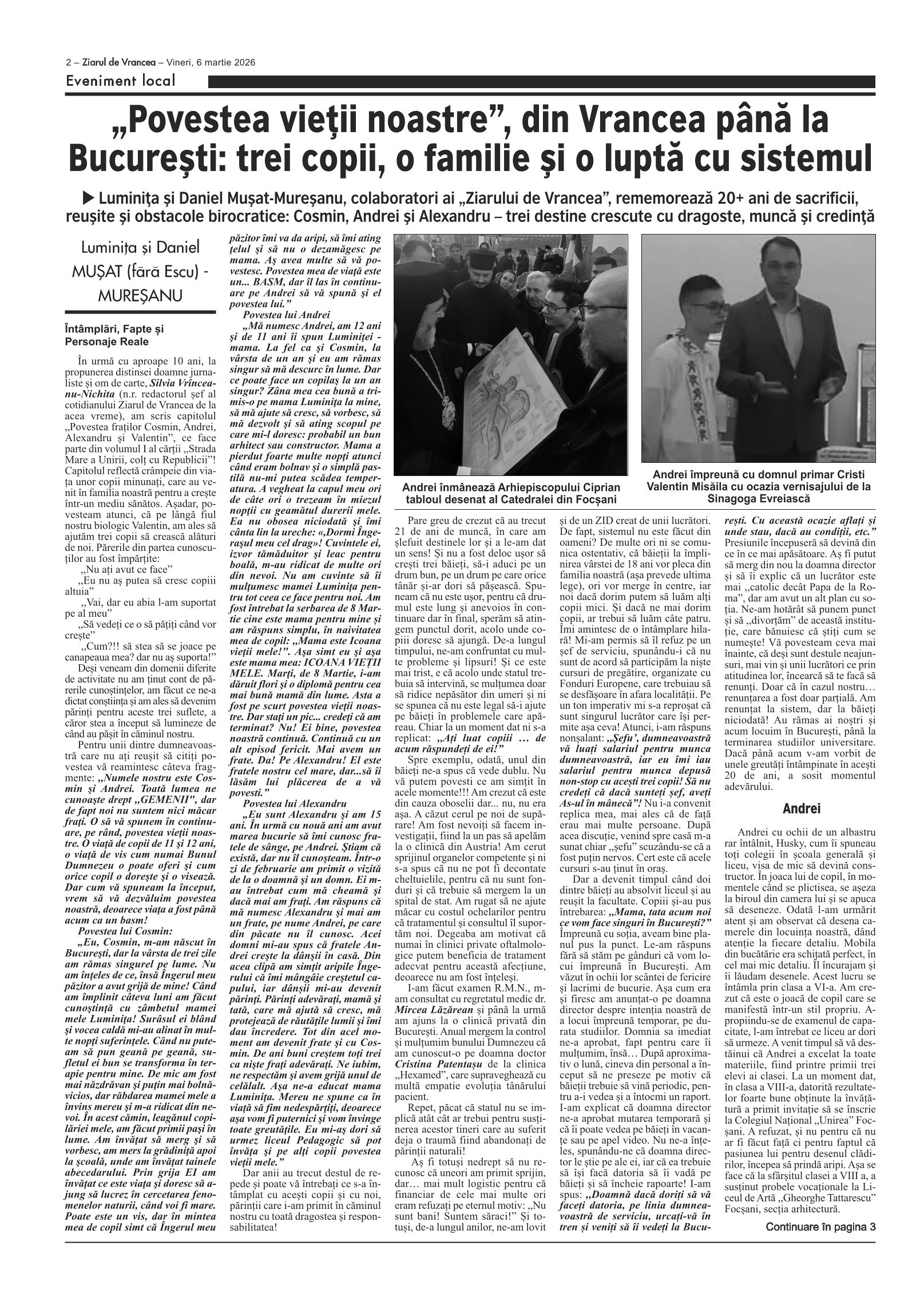 Luminița și Daniel Mușat-Mureșanu, colaboratori ai „Ziarului de Vrancea”, rememorează 20+ ani de sacrificii, reușite și obstacole birocratice: Cosmin, Andrei și Alexandru – trei destine crescute cu dragoste, muncă și credință.