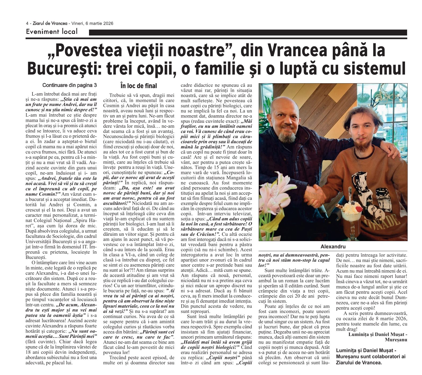 În urmă cu aproape 10 ani, la propunerea distinsei doamne jurnaliste și om de carte, Silvia Vrînceanu-Nichita ( n.r. redactorul șef al cotidianului Ziarul de Vrancea de la acea vreme), am scris capitolul „Povestea fraților Cosmin, Andrei, Alexandru și Valentin”, ce face parte din volumul I al cărții ,,Strada Mare a Unirii, colț cu Republicii”!