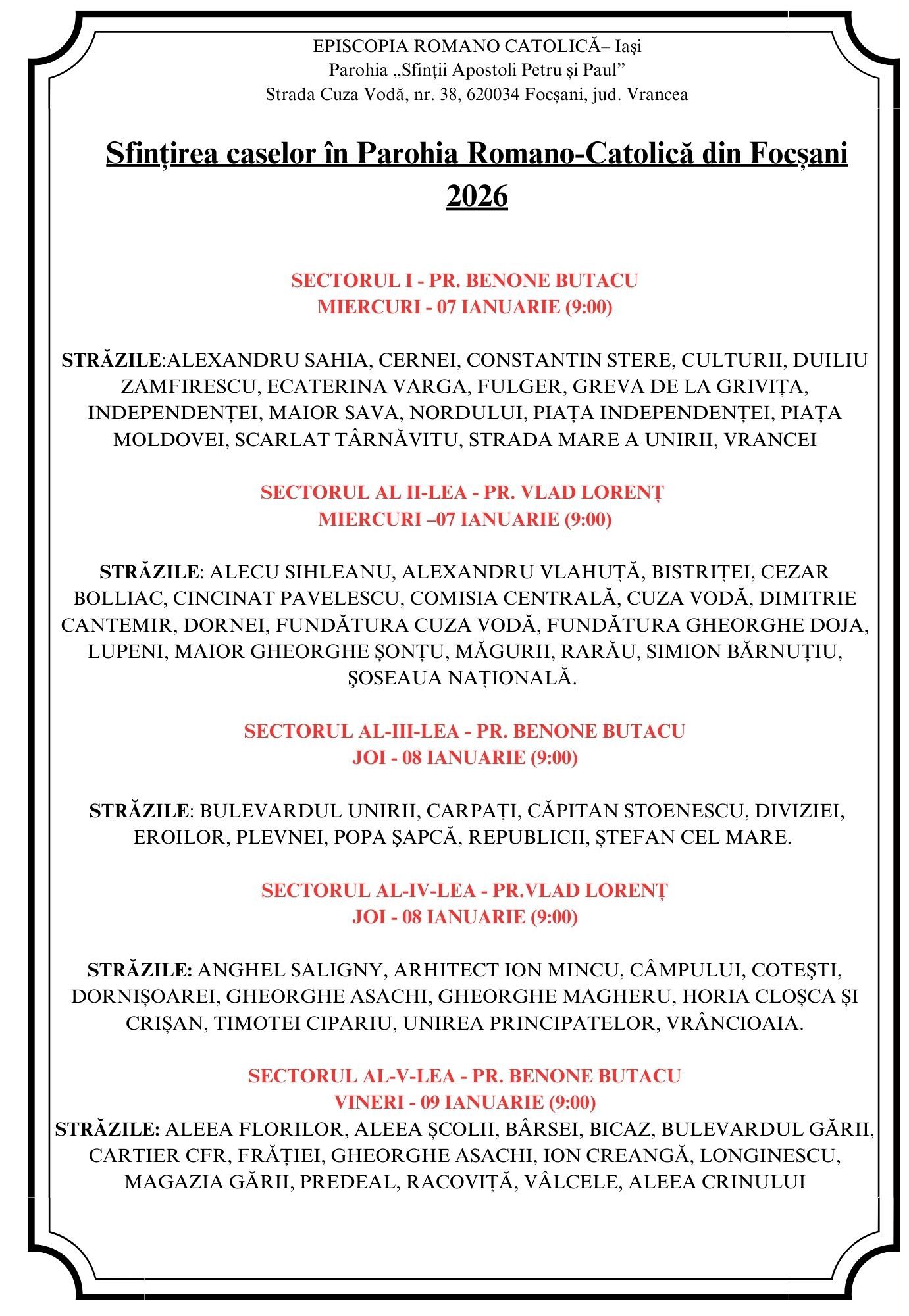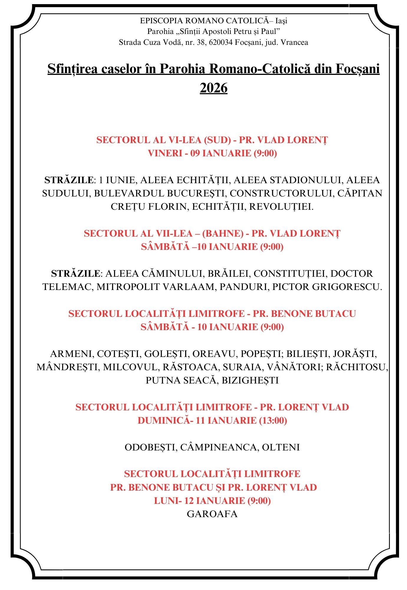 „Sfințirea caselor în Parohia romano-catolică Focșani se începe din 07 ianuarie 2026 și vom continua pe 08, 09, 10, 11 și 12 ianuarie de pe 13 ianuarie 2026 vom face reprogramările pe care le veți anunța din timp la biroul parohial” , precizează preoții Parohiei romano-catolice Focșani .