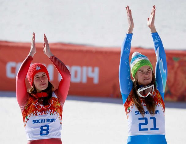 Un fapt foarte rar s-a întamplat în istoria olimpică s-a înregistrat, ieri, la Jocurile Olimpice de Iarnă de la Soci. În proba de coborare, s-au acordat două medalii de aur, pentru că schioarele Dominique Gisin (Elveţia) şi Tina Maze (Slovenia) au fost cronometrate în acelaşi timp: 1:41,57, exact la zece sutimi de a treia clasată, elveţianca Lara Gut. Dominique Gisin, 28 de ani, este prima elveţiancă medaliată cu aur la coborare după Michaëla Figini, acum 30 de ani, la Sarajevo în 1984. Tina Maze, 29 de ani, a reuşit să caştige titlul olimpic pentru prima oară în carieră, ea avand deja două medalii de argint. Ea a dominat anul trecut în Cupa Mondială, dar în acest an a avut evoluţii şterse. Reprezentanta Romaniei, Ania Caill, a ratat o poartă şi a abandonat. Concurenta Edith Miklos, care a reprezentat Romania la Olimpiada trecută, s-a clasat pe un excelent loc VII. Din păcate, sportiva născută la Miercurea Ciuc a decis să reprezinte Ungaria după Vancouver.