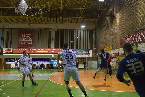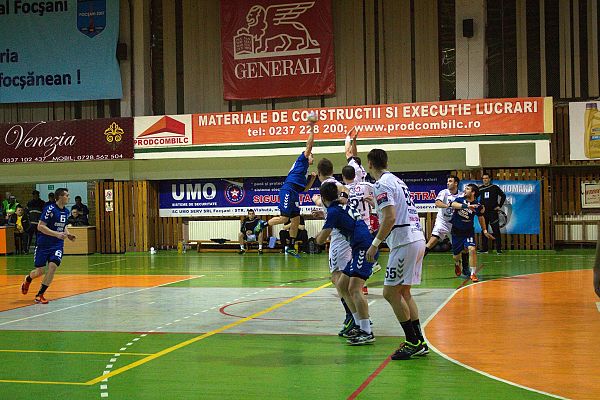 După ce în tur băimărenii se impuseseră pe teren propriu cu scorul de 27-23, duminică seara focşănenii şi-au luat revanşa, învingând şi mai clar, 28-23 (11-11), la capătul unui meci superb. Având parte de această dată de un arbitraj corect (arbitrii G. Băducu (BZ) / R. Voicu (BZ), observator V. Dăncescu (B), şi de sprijinul publicului care a umplut şi de această dată până la refuz Sala Polivalentă din Focşani, echipa noastră a început ceva mai greu meciul, băimărenii conducând ostilităţile până în minutul 12. Cele două echipe au mers cap la cap până la jumătatea primei reprize, când tabela de marcaj arata 6-6. Pentru prima dată echipa noastră avea să se desprindă la 3 goluri în minutul 21, scor 10-7. Andrei Popescu de la oaspeţi a egalat la 10, prin 3 goluri consecutive, dar în pauză avea să se intre cu 11-11. După reluarea jocului, antrenorul nostru, Viorel Ciubotaru, a schimbat excelent formula de joc, trimiţându-l în centru, pe post de coordonator de joc, pe Silviu Rotaru, iar pe extrema dreapta pe Năstăsie.