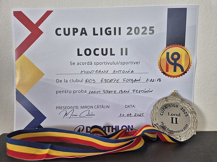 Tânăra înotătoare Antonia Munteanu, legitimată la ACS Escape Focșani, a urcat pe podium la Cupa Ligii Performanței la Natație, la două probe. Prima probă, unde a obținut medalia de argint, este 100 m spate, iar la cea de-a doua proba, 50 m spate, a obținut medalia de bronz