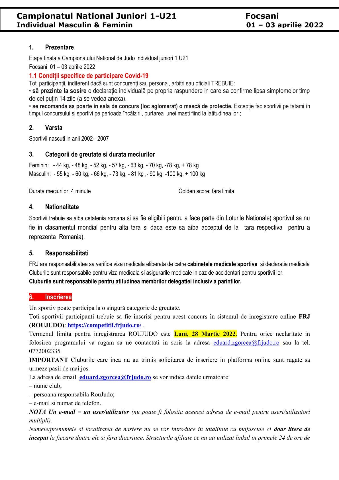 Campionatul național de judo, juniori I (U21) va avea loc vineri, sâmbătă și duminică în Sala Sporturilor Vrancea și este organizat de Federația Română de Judo în colaborare cu CSM Focșani 2007-LPS Focșani, CS Unirea Focșani, CSS Focșani, Mondo Sport Focșani și Direcția Județeană de Sport Vrancea.
