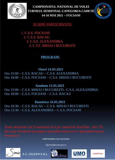 ”Vă facem cunoscut programul meciurilor turneului semifinal din cadrul campionatului național de volei feminin, categoria cadete, care se va desfășura la Focsani, in perioada 14 - 16 mai 2021. Partidele se vor disputa in sala Liceului cu Program Sportiv Focsani, strada 1 Decembrie 1918, nr. 33.. Ținem pumnii fetelor noastre si speram sa avem parte de un spectacol sportiv de excepție.”-Volley Focsani