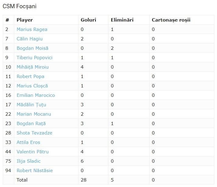CSM Focșani 2007: Cloșcă – 1 gol, Marocico, Tevzadze - Ragea, Hagiu – 2, Moisă, Popovici -1, Miroiu – 4, Popa – 1, Țuțu – 3, Mocanu – 2, Rață – 3, Eros – 1, Pătru – 4, Sladic – 6, Năstăsie.