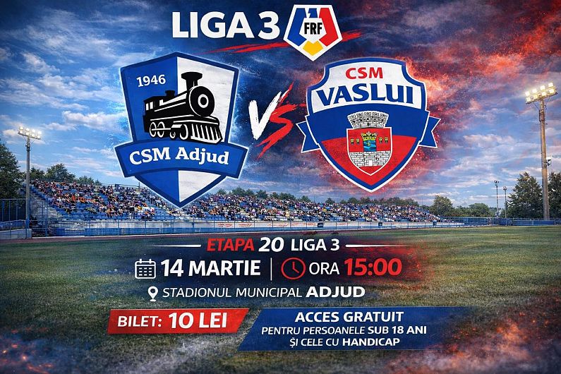 CSM Adjud 1946 a terminat la egalitate, scor 1-1, partida disputată sâmbătă, 14 martie 2026, pe teren propriu, împotriva formației CSM Vaslui, în cadrul etapei a 20-a din Liga a III-a, Seria 1. Meciul a fost unul echilibrat, în care cele două echipe și-au împărțit punctele după un duel intens pe parcursul celor 90 de minute.