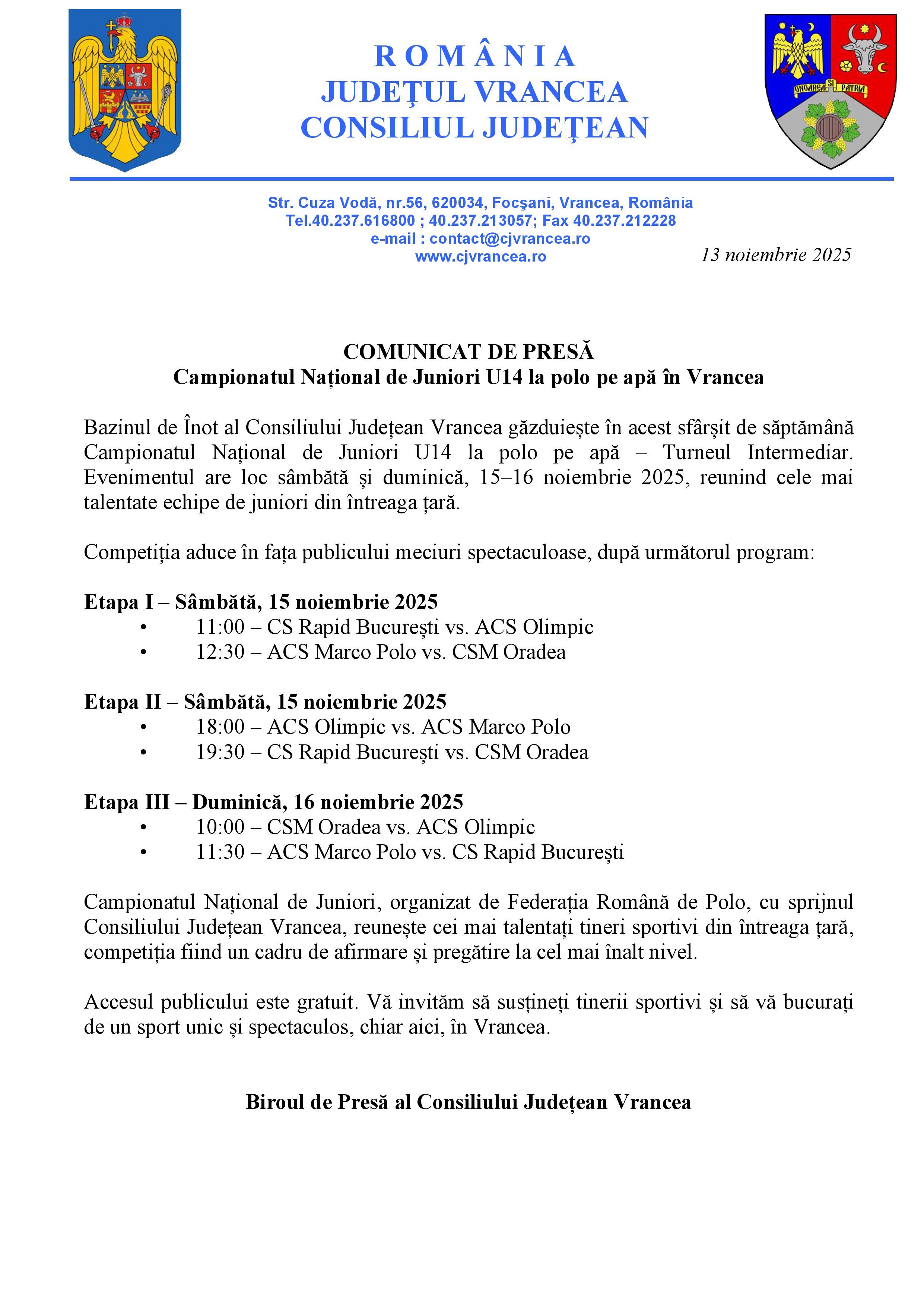 Consiliul Județean Vrancea încurajează publicul să vină în număr cât mai mare pentru a susține tinerii sportivi și pentru a se bucura de atmosfera spectaculoasă a poloului pe apă, un sport complex și plin de energie.