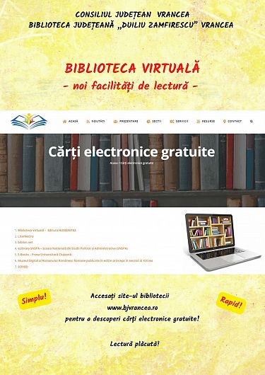 Începând din luna aprilie a acestui an, Biblioteca Județeană „Duiliu Zamfirescu” Vrancea, prin Biroul de Achiziții și Prelucrare Carte, oferă utilizatorilor noștri posibilitatea de a citi ON-LINE și GRATUIT cărți cu text integral în format electronic.
