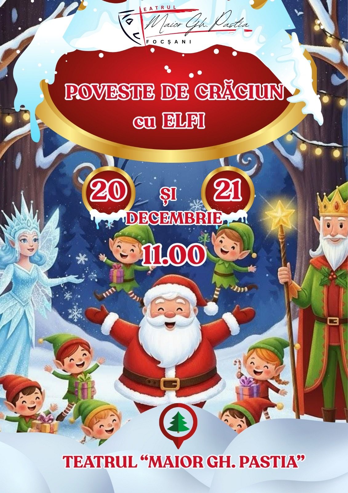 Pe 20 și 21 decembrie, cei mici sunt invitați la Teatrul „Maior Gh. Pastia”, unde, de la ora 11.00, va fi pusă în scenă piesa „Poveste de Crăciun cu elfi”. Un spectacol interactiv, vesel și plin de magie, dedicat copiilor și părinților.
