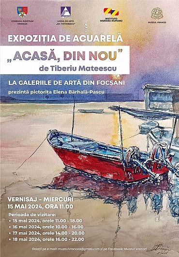 Consiliul Județean Vrancea, prin Muzeul Vrancei, în parteneriat cu Institutul Hispano-Român din Castellon (Spania) si Liceul de Artă „Gh. Tattarescu” din Focșani, organizează miercuri 15 mai, la ora 11:00, de Ziua Picturii Naționale, vernisajul expoziției de acuarelă „Acasă, din nou” a pictorului Tiberiu Mateescu.
