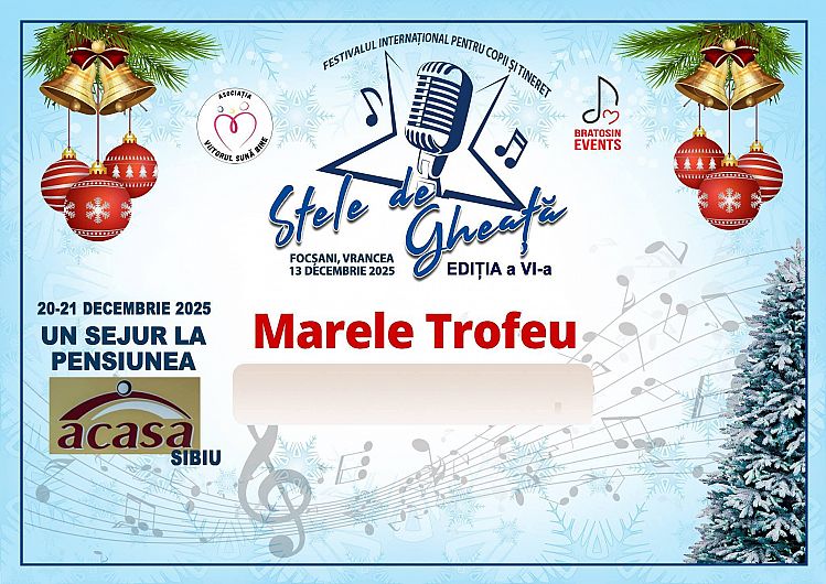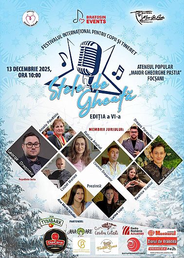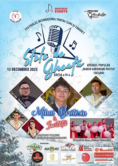 Ateneul Popular „Maior Gheorghe Pastia” din Focșani va vibra, pe 13 decembrie 2025, începând cu ora 10.00, sub energia și emoția tinerilor artiști care vor participa la Festivalul Internațional de Muzică pentru Copii și Tineret „Stele de Gheață”, ajuns la Ediția a VI-a. Evenimentul, organizat de Bratosin Events, se anunță a fi unul dintre cele mai importante festivaluri muzicale dedicate copiilor și adolescenților în județul Vrancea.