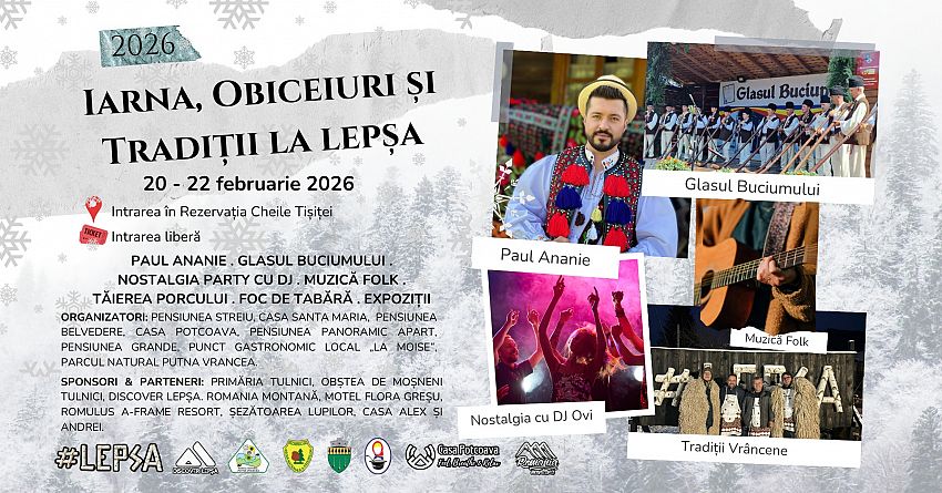 Lepșa, județul Vrancea, la intrarea în Rezervația Naturală Cheile Tișiței, devine, în perioada 20–22 februarie 2026, gazda celei de-a doua ediții a evenimentului „Iarna – Tradiții și Obiceiuri la Lepșa”, o manifestare dedicată păstrării identității culturale vrâncene și promovării turismului autentic de iarnă în Munții Vrancei.