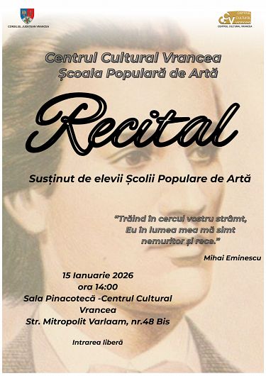Vrancea își reafirmă rolul activ pe harta culturală a României la început de an 2026. Joi, 15 ianuarie, de Ziua Culturii Naționale, Consiliul Județean Vrancea, prin Centrul Cultural Vrancea, organizează un eveniment dedicat memoriei poetului național Mihai Eminescu, la împlinirea a 176 de ani de la nașterea acestuia.